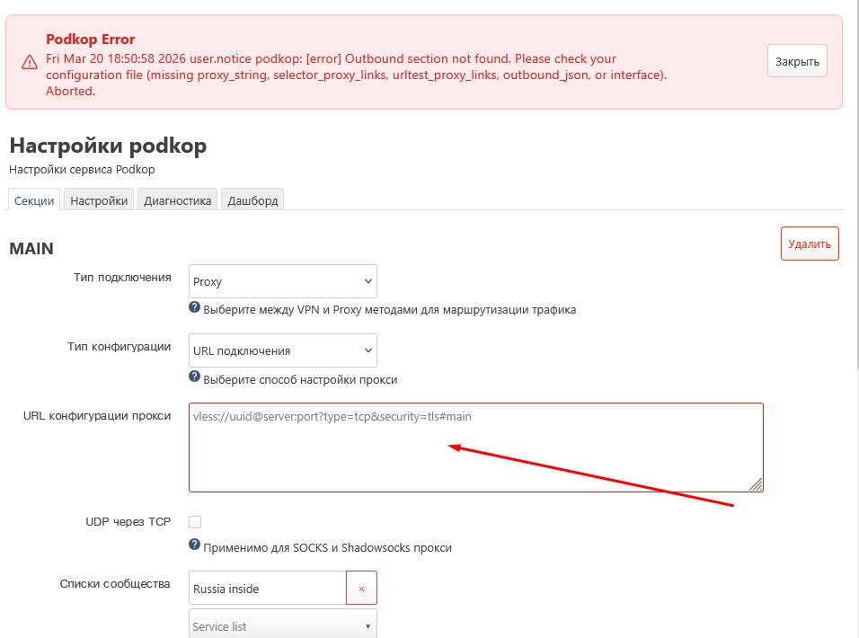 Fri Mar 20 18:50:58 2026 user.notice podkop: [error] Outbound section not found. Please check your configuration file (missing proxy_string, selector_proxy_links, urltest_proxy_links, outbound_json, or interface). Aborted.
