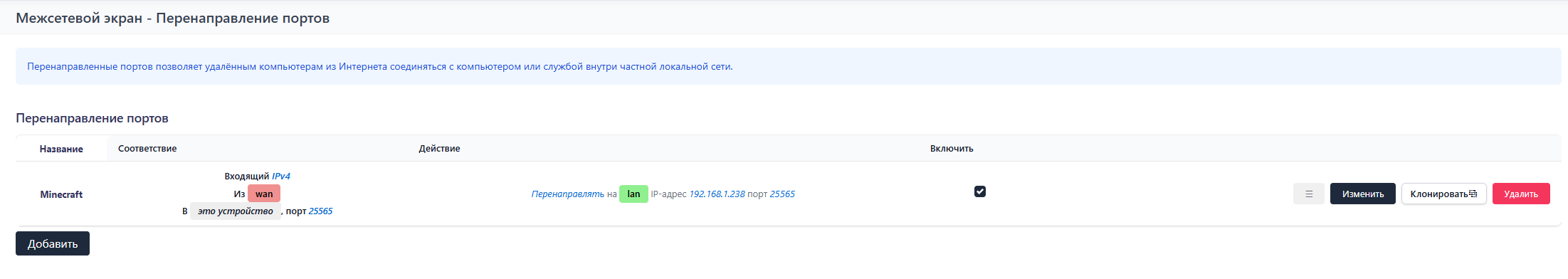 И используя кнопку Добавить, добавьте необходимый порт для открытия, выберите тип трафика TCP\UDP, а также укажите локальный IP адрес сервера.