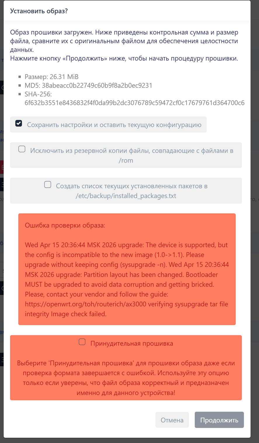 Вам нужно снять галочку с сохранить настройки и поставить на принудительную прошивку - через 3 минуты обновить страницу